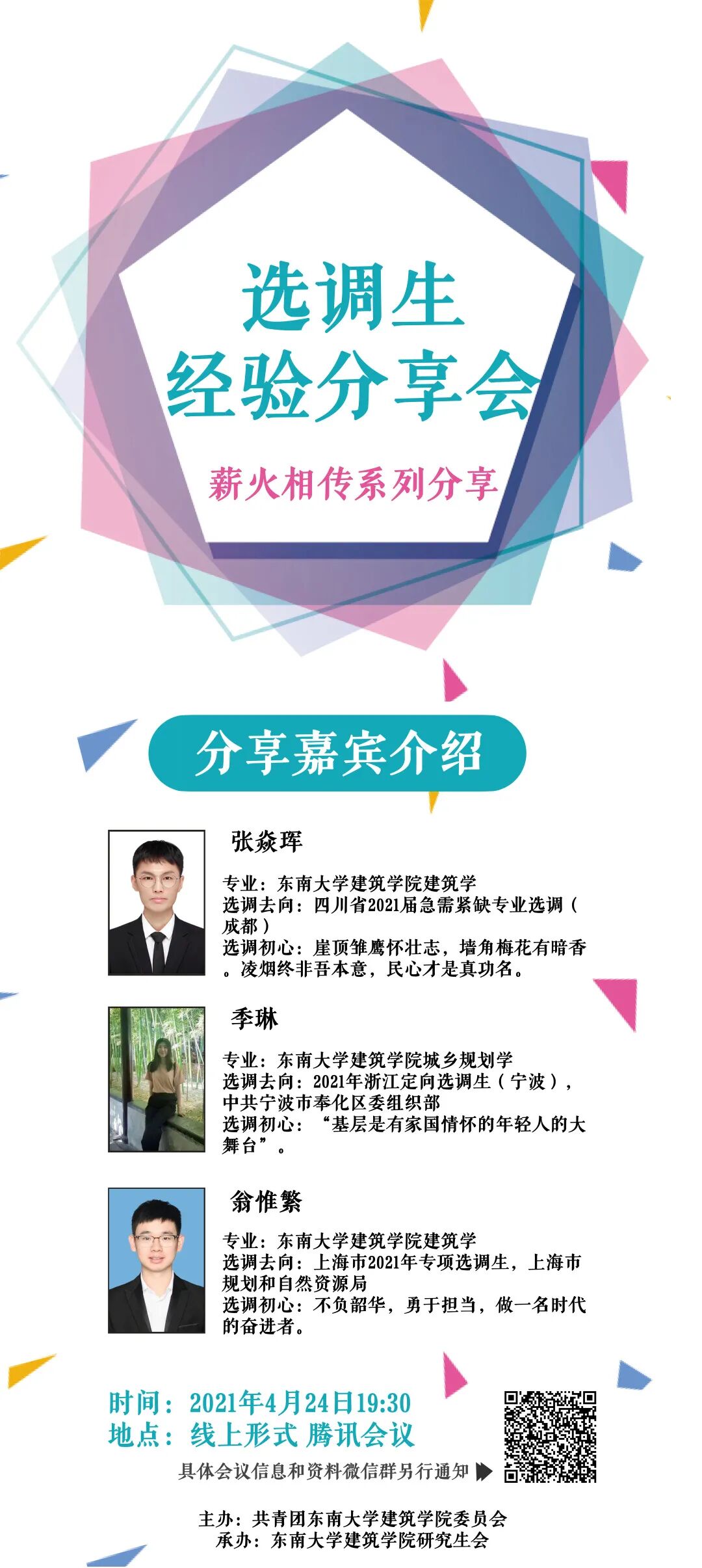 2021年4月24日晚将在线上进行“薪火相传”系列分享会之一的选调生经验分享会,此次分享邀请到了三位2021届的学长学姐为我们做相关介绍。