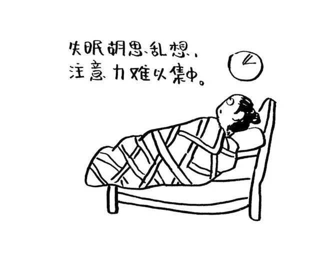 症状:一是晚上难以入睡,二是半夜睡眠很浅,容易醒来且难以再次入眠,三是清晨很早就醒来,上述三种症状常常伴随忧虑担心等,因此而出现失眠。