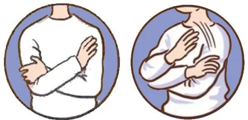 闭上眼晴或半合眼,双臂交叉放在胸前,双手变替摆动,轻拍双肩,同时缓慢深呼吸。