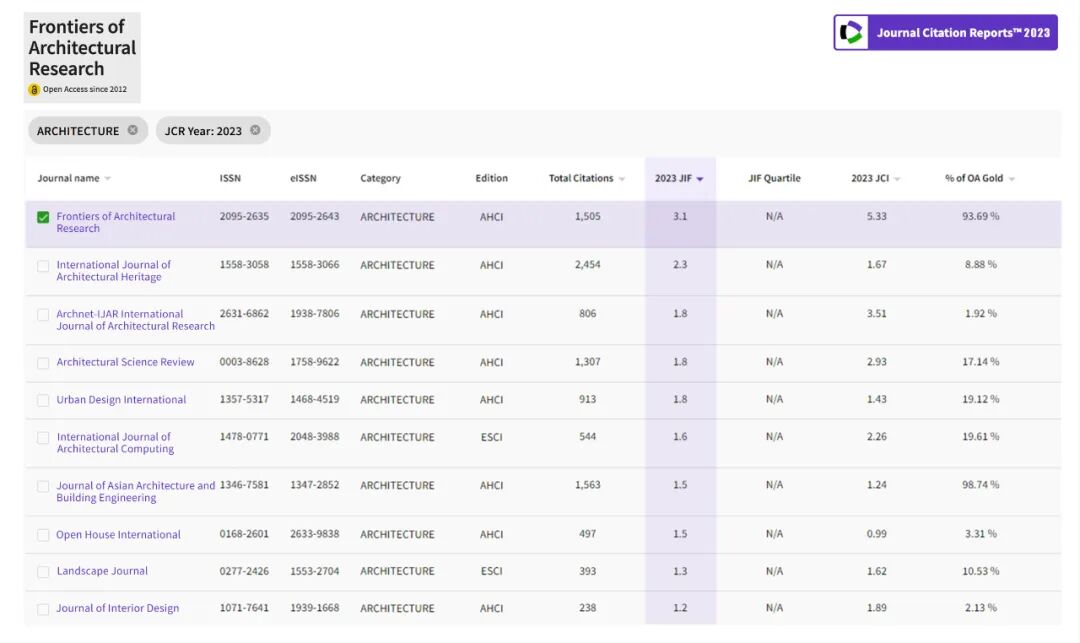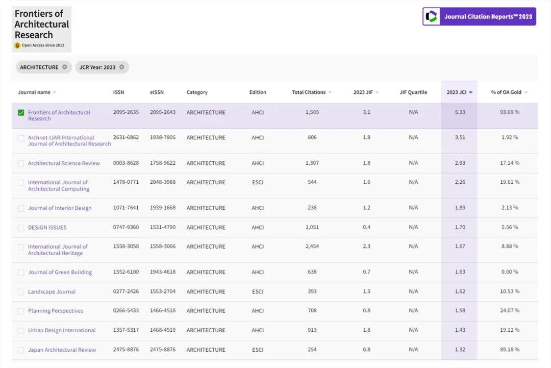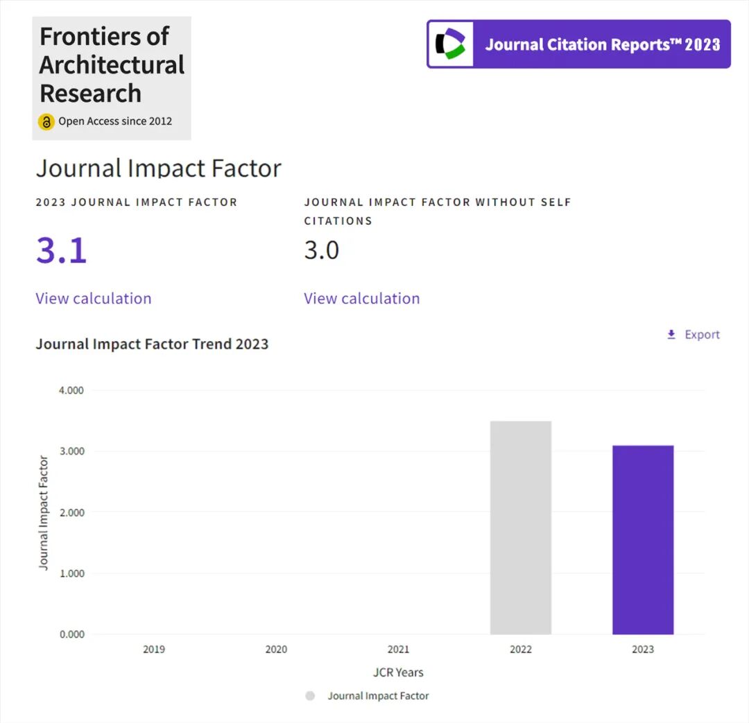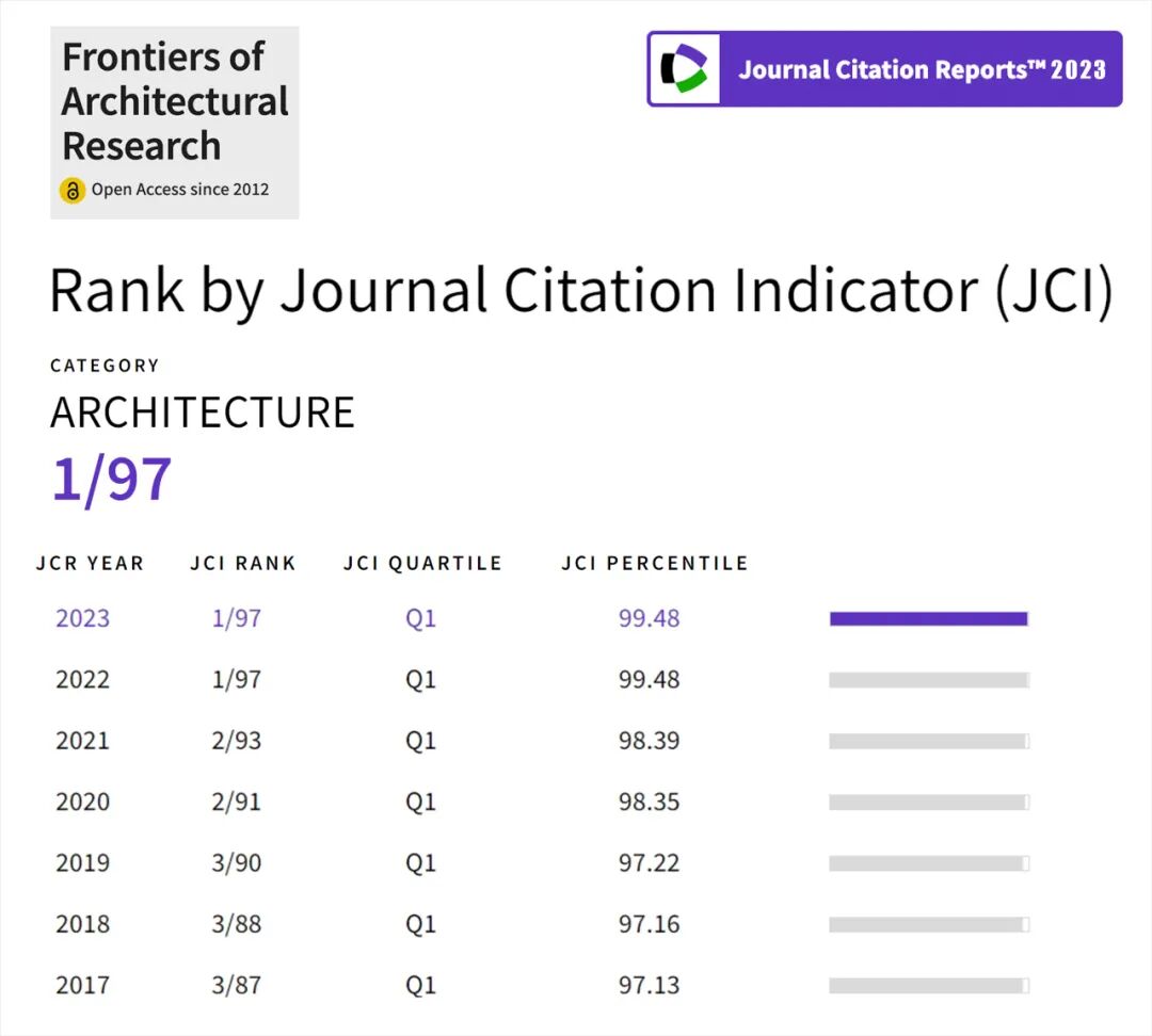 2024年6月20日,科睿唯安(Clarivate Analytics)发布了2023年度期刊引证报告(JCR)。其中,Frontiers of Architectural Research (以下简称FoAR) 影响因子 IF 为 3.1,期刊引文指标 JCI 上升为 5.33,以上两项评价指标在全球建筑领域 WoS 核心合集期刊中 均排名第一!位居 Q1 分区。